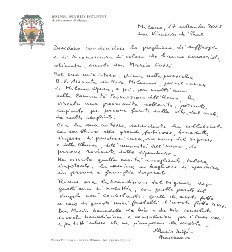 Desidero condividere la preghiera di suffragio e di riconoscenza di coloro che hanno conosciuto, stimato, amato don Mario Sozzi.
